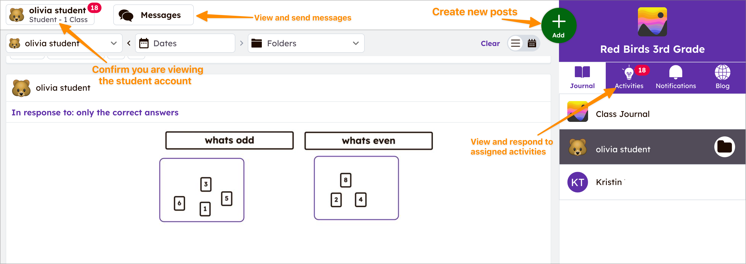 الفرق الرئيسي بين حسابات الطلاب والعائلة هو أن أفراد العائلة يمكنهم عرض الرسائل المرسلة إلى العائلة والرد عليها، بينما لا يمكن للطلاب ذلك. الشبه الرئيسي هو أن كلاهما يمكنهما تنزيل اليوميات المآرشة، وعرض الأعمال المعتمدة، والإعجاب/التعليق/التنزيل/الحفظ للمحتوى.