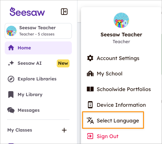 Teachers can choose their Preferred language from the dropdown menu by tapping their profile icon. This overrides the current School Setting set by the administrator. Once selected, the Seesaw app will refresh and appear in your preferred language. Preferred language can be changed at any time.
