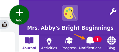 Les alertes pour les nouvelles notifications apparaissent à deux endroits clés dans Seesaw. Recherchez le "bijou" rouge dans l'onglet Centre de notifications :