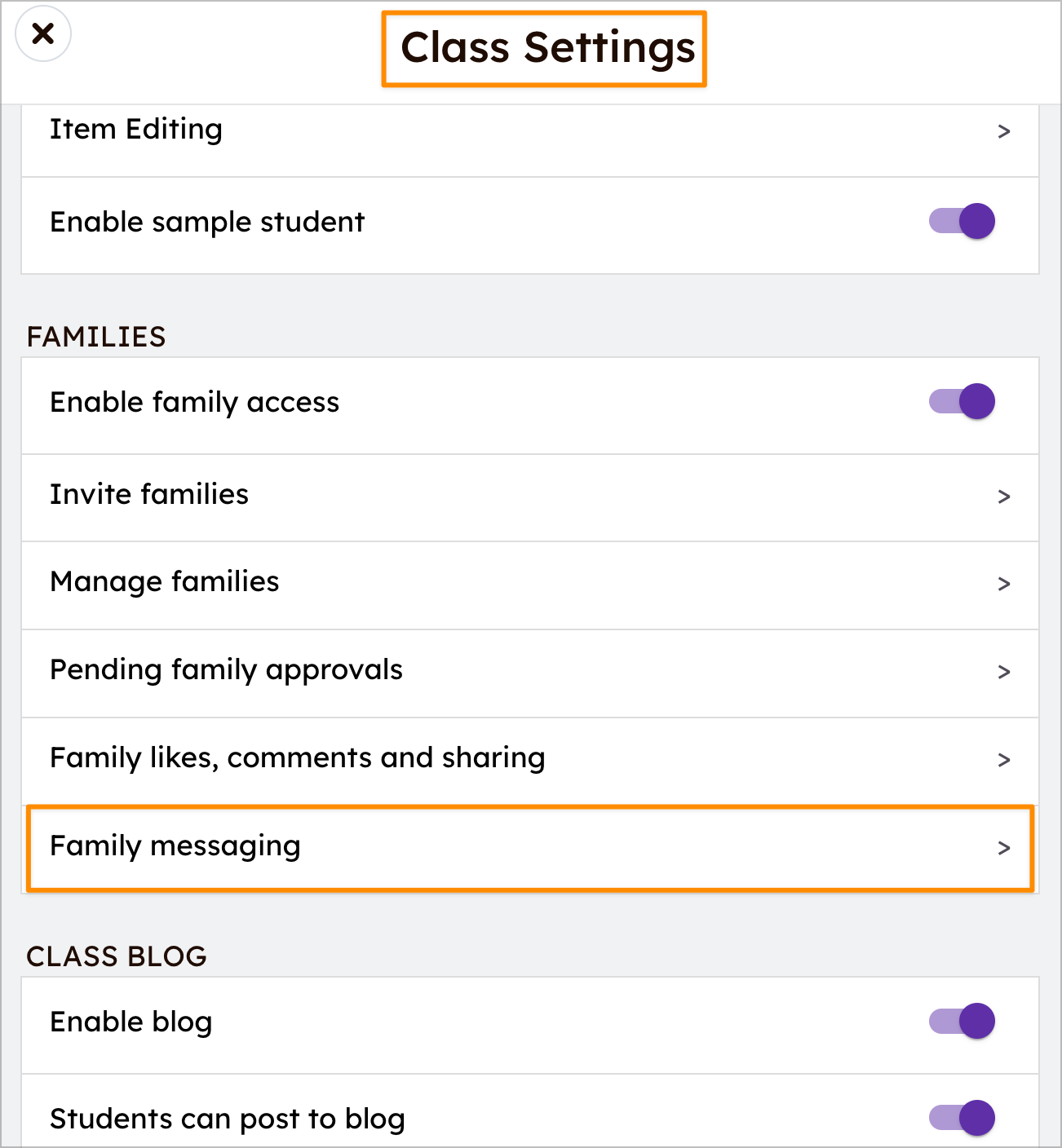 Accédez à Paramètres de classe (icône de clé à molette) > Familles > sélectionnez Messagerie familiale.