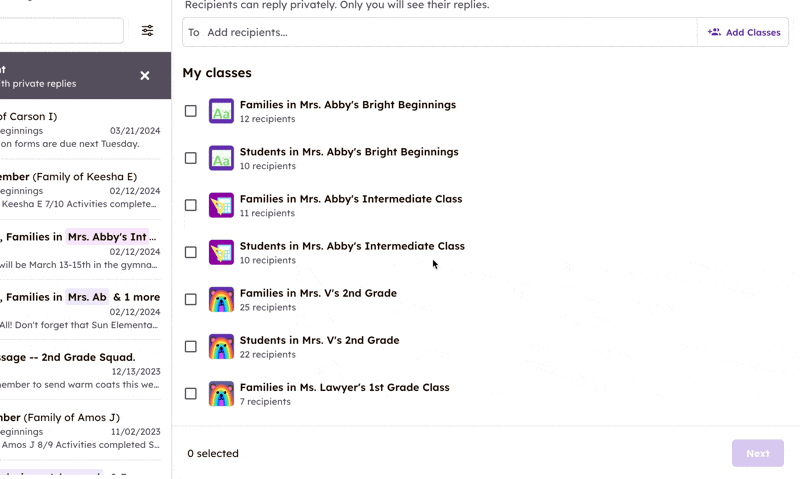 1. Lorsque vous créez un fil de discussion d'annonce, sous Ajouter des classes>Sélectionner des classes, activez le bascule.