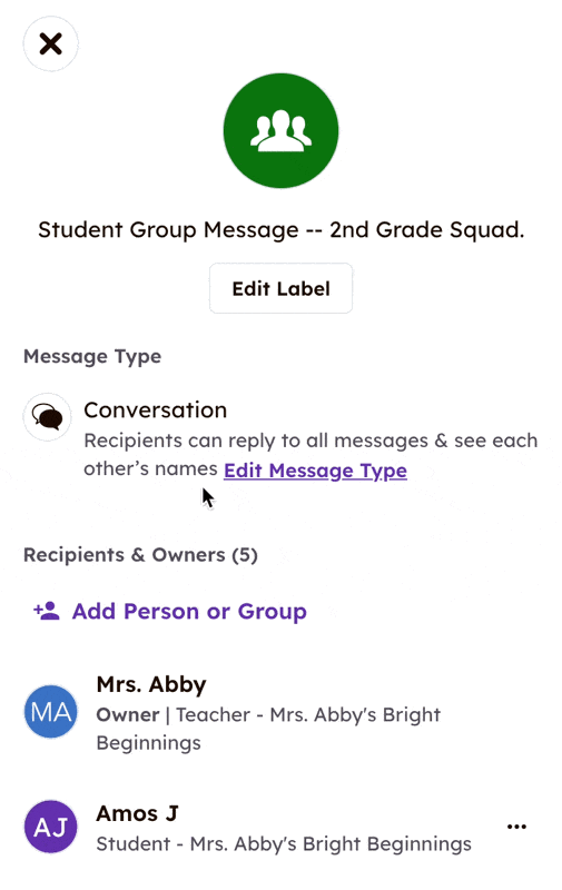 Tout enseignant ou administrateur qui est ajouté par nom aux destinataires d'un fil de discussion d'annonce devient automatiquement un propriétaire et peut envoyer des annonces dans le fil.