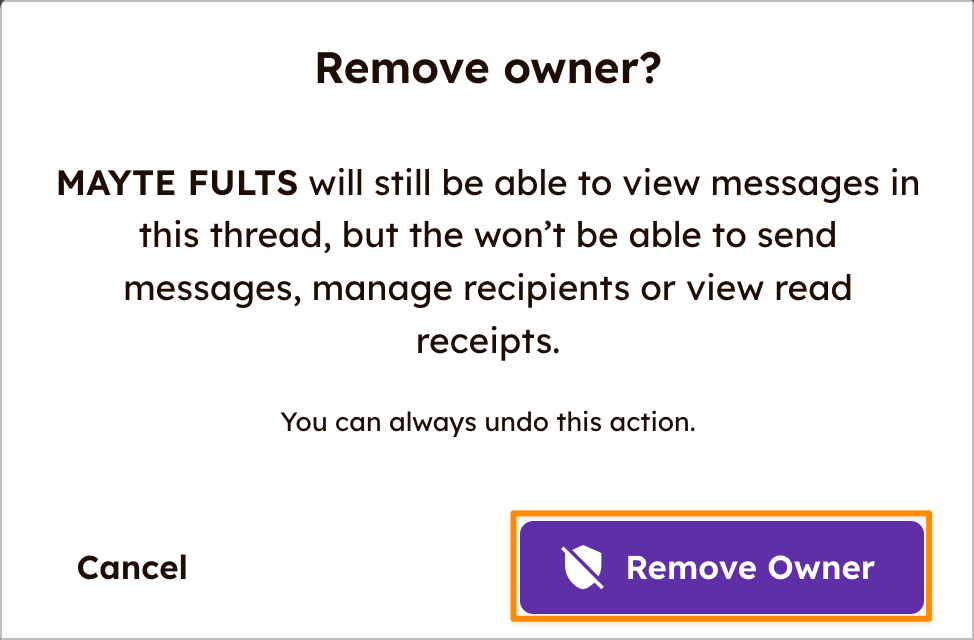 Les propriétaires supprimés ne pourront pas envoyer de messages, gérer les destinataires ou consulter les accusés de réception.