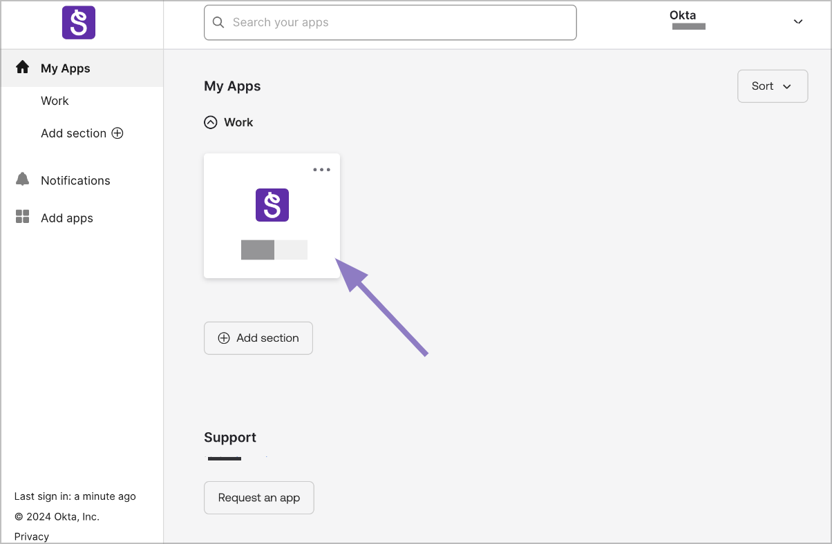 - अपने ओक्टा ऑर्ग में लॉगिन करें और डैशबोर्ड में सीसॉ ऐप टाइल देखें।