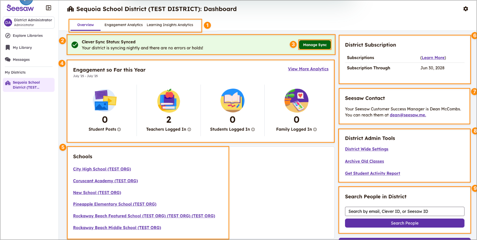 - Schede della Dashboard del Distretto: Visualizza le analisi di Engagement e Learning Insights per il tuo Distretto e le Scuole. Seleziona Panoramica per tornare alla Dashboard principale del Distretto.
