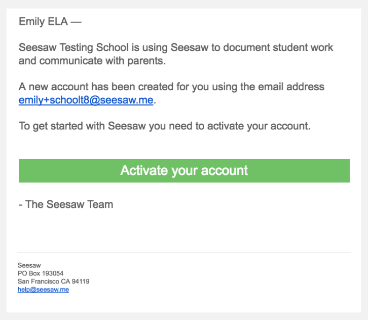 선생님 계정 활성화 이메일을 다시 보내는 방법은 무엇인가요 활성화되지 않은 모든 선생님들에게 활성화 이메일을 다시 보내려면: https://app.seesaw.me/에서 관리자 계정으로 로그인합니다. 관리자 도구 섹션에서 계정 활성화 이메일 다시 보내기를 클릭합니다. "계정 활성화 이메일 보내기" 버튼을 클릭합니다.