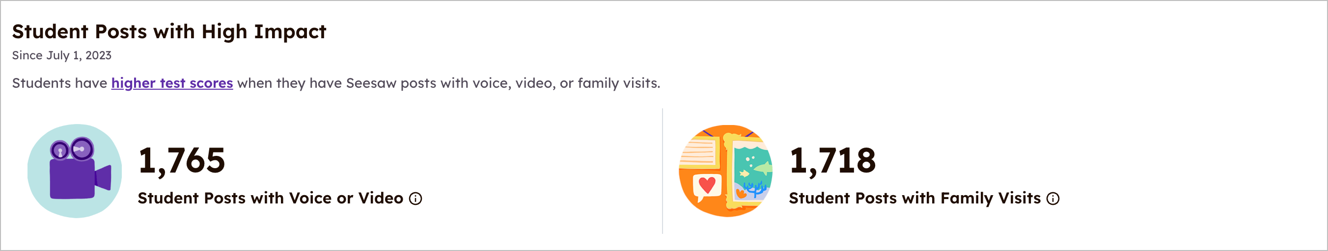 참여 대시보드를 통해 관리자는 학교 및 지역 수준에서 교사, 학생 및 가족 Seesaw 사용량을 더 잘 이해할 수 있습니다. 학교 수준에서는 교사 및 학생 플랫폼 활동, 할당된 활동 수, 가족 방문/상호 작용, 강조된 학생 게시물 등의 데이터가 포함됩니다. 지역 수준에서는 관리자가 학교 수준에서 롤업된 데이터를 볼 수 있어 지역 전체 사용량을 더 잘 이해할 수 있습니다.