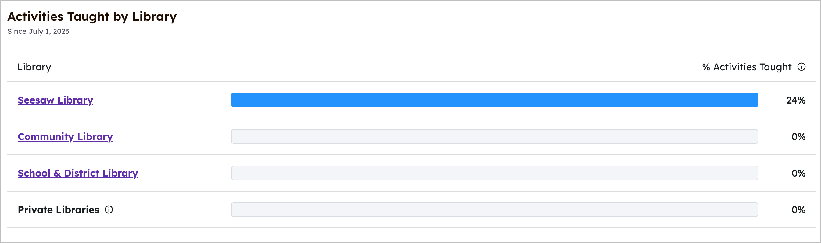 참여는 도서관별로 나열되며 도서관 당 가르친 활동의 백분율이 함께 표시됩니다.