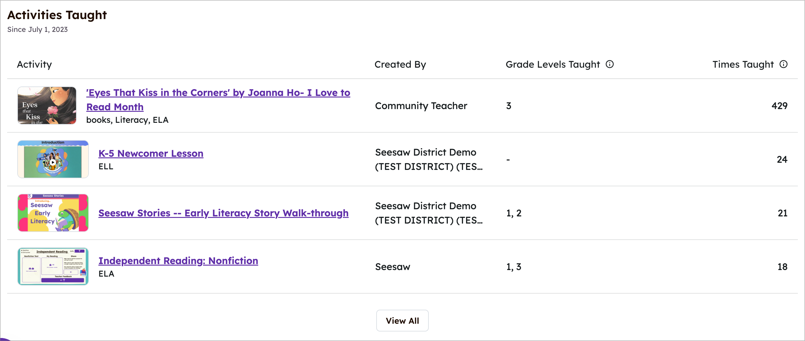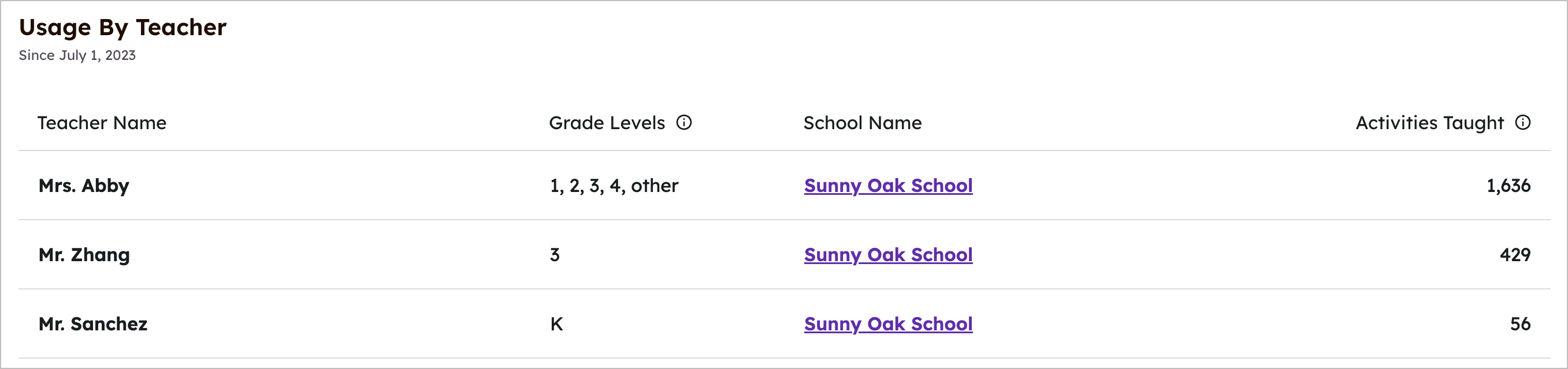 활동 이름별로 나열된 활동, 생성자, 가르치는 학년, 그리고 가르친 횟수입니다. (가르친 횟수는 활동이 학생들에게 할당된 횟수입니다.)