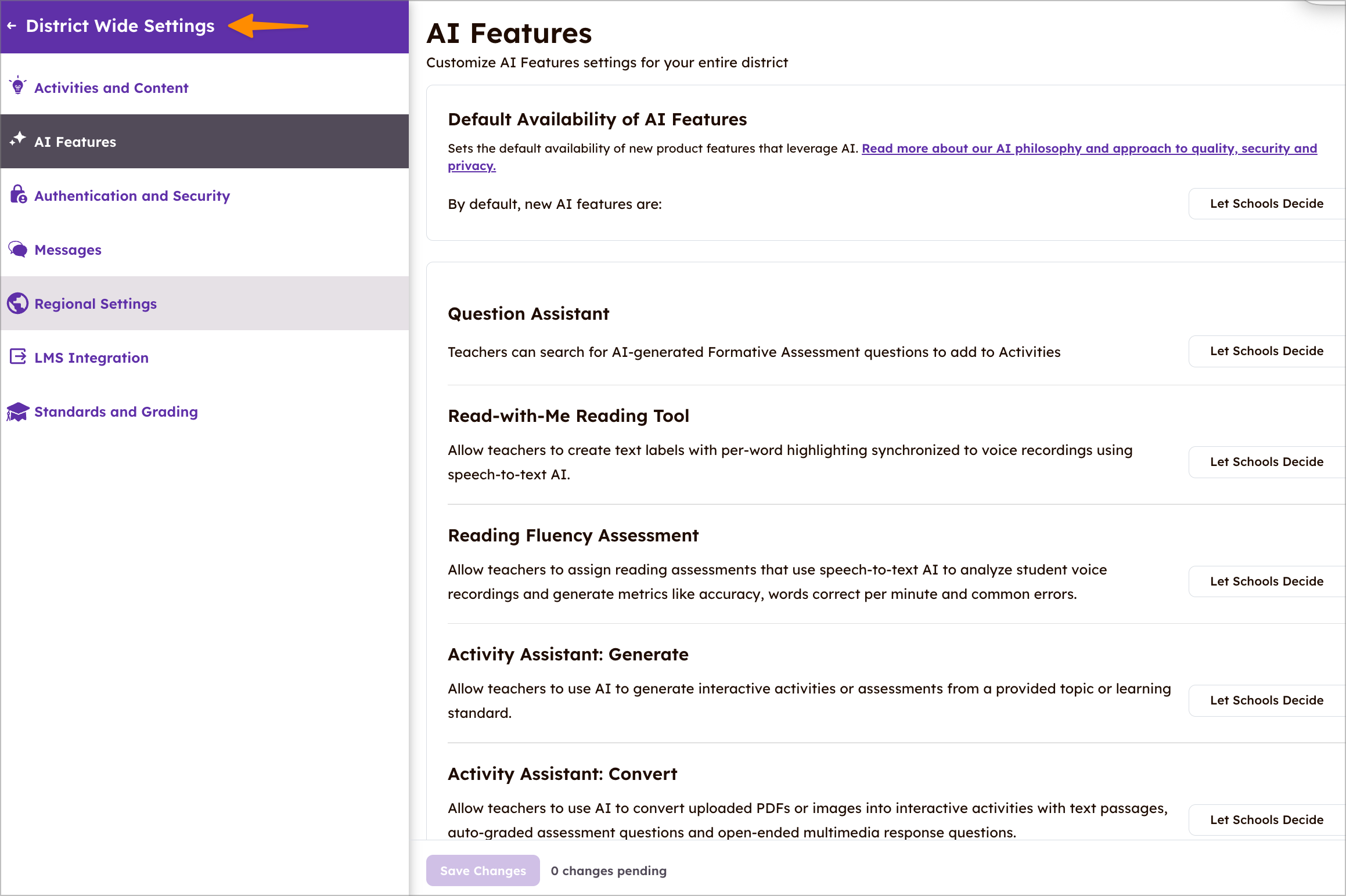 Pentadbir boleh memilih ketersediaan lalai ciri-ciri yang menggunakan AI. Ciri AI baru boleh dilumpuhkan sehingga diaktifkan oleh pentadbir. Selain itu, Pentadbir boleh melaraskan ketersediaan untuk ciri AI sedia ada, seperti Pembantu Soalan, Alat Membaca Bersama Saya, Penilaian Kefasihan Membaca, Penjana Aktiviti Pembantu, Penukar Aktiviti Pembantu, Terjemah Aktiviti, dan Penjana Pengumuman.