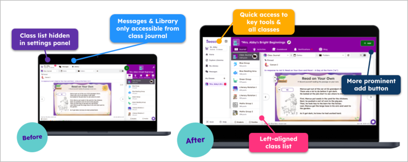முக்கிய செயல்கள் இப்போது முன்னணி மற்றும் மையத்தில் உள்ளன, உங்கள் வகுப்பு பட்டியல் புதிய வழிசெலுத்தலுடன் அழகாக ஒழுங்குபடுத்தப்பட்டுள்ளது, வகுப்பு மேலாண்மையை எப்போதும் எளிதாக்குகிறது.