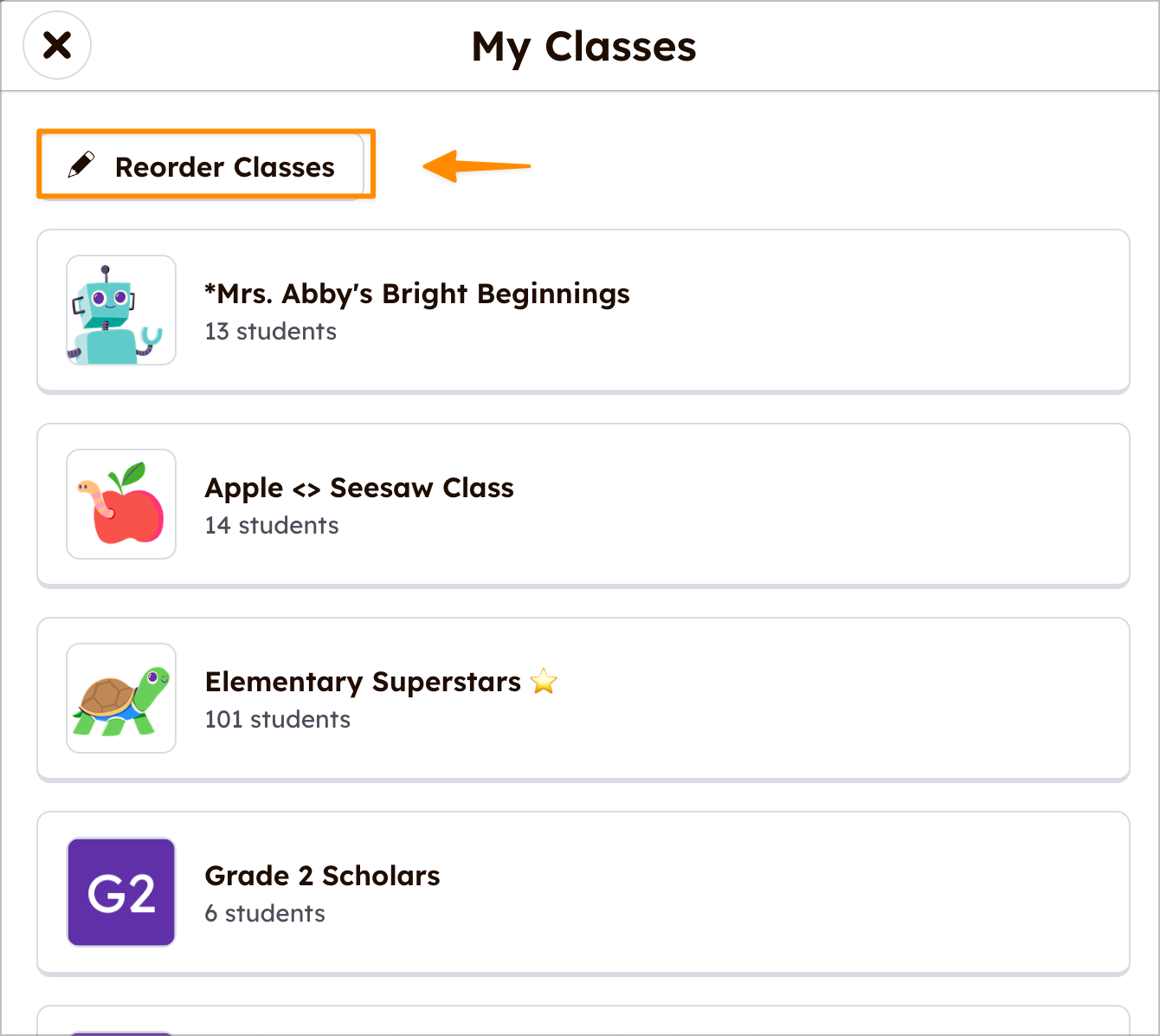 ஆசிரியர்கள் தங்களது விருப்பங்களின் அடிப்படையில் என் வகுப்புகள் ஐ ஒழுங்குபடுத்த வகுப்புகளை மறுசீரமை பொத்தானை தட்டுவதன் மூலம் தேர்வு செய்யலாம். உங்கள் முக்கியமான வகுப்புகளை மேல் கொண்டு வர வகுப்புகளை இழுத்து விடுங்கள்.