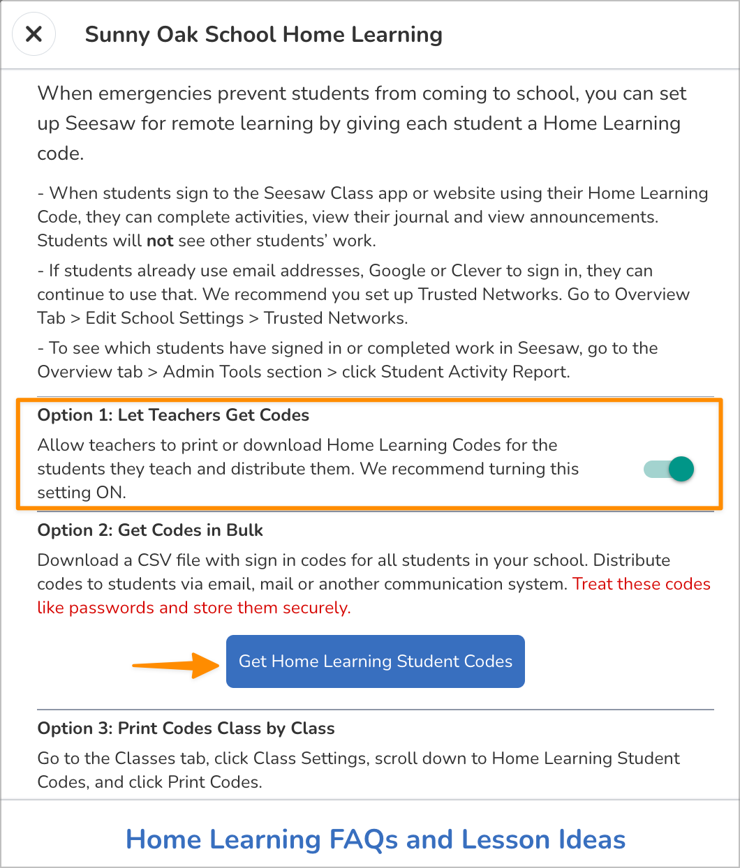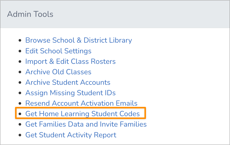 - உங்கள் பள்ளி டாஷ்போர்டின் கண்ணோட்டத் தாவலில் இருந்து, Admin Tools (கீழே வலது பக்கம்) சென்று Get Home Learning Student Codes என்பதைக் கிளிக் செய்யவும்.