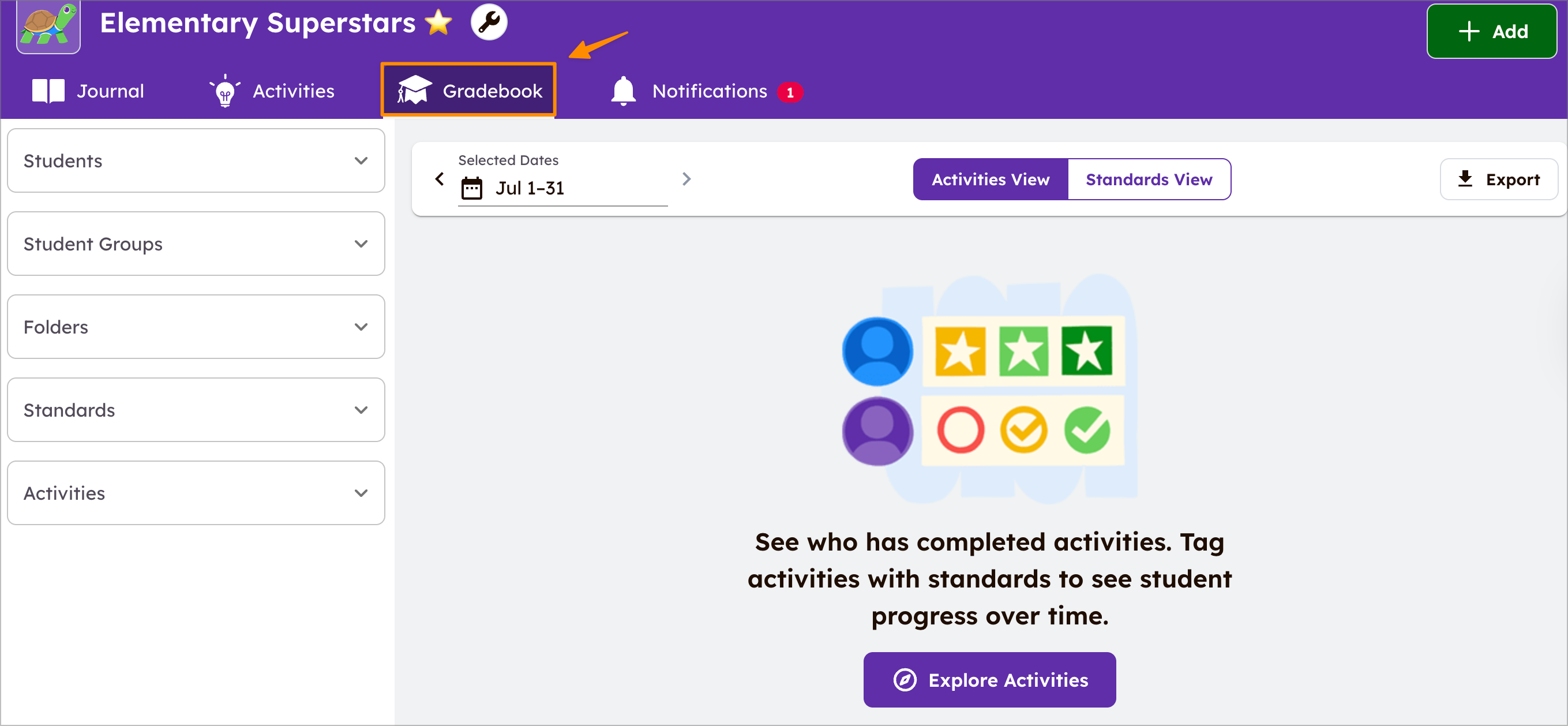 Seesaw இல் மாணவர்களின் முன்னேற்றத்தை எளிதாகப் பார்க்கவும் புரிந்துகொள்ளவும் உங்கள் வகுப்புகளுடன் Gradebook (முந்தைய பெயர் Progress) ஐ பயன்படுத்துங்கள். Gradebook Seesaw பள்ளி மற்றும் மாவட்ட சந்தாக்களுடன் உள்ள அனைத்து ஆசிரியர்களுக்கும் நிர்வாகிகளுக்கும் கிடைக்கிறது. அணுக, உங்கள் Seesaw கணக்கில் வலை உலாவியில் உள்நுழைந்தபோது Gradebook தாவலைத் தட்டவும்.