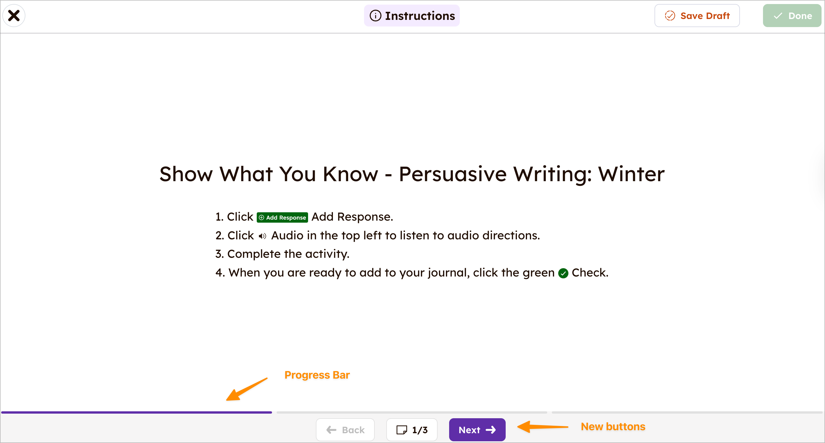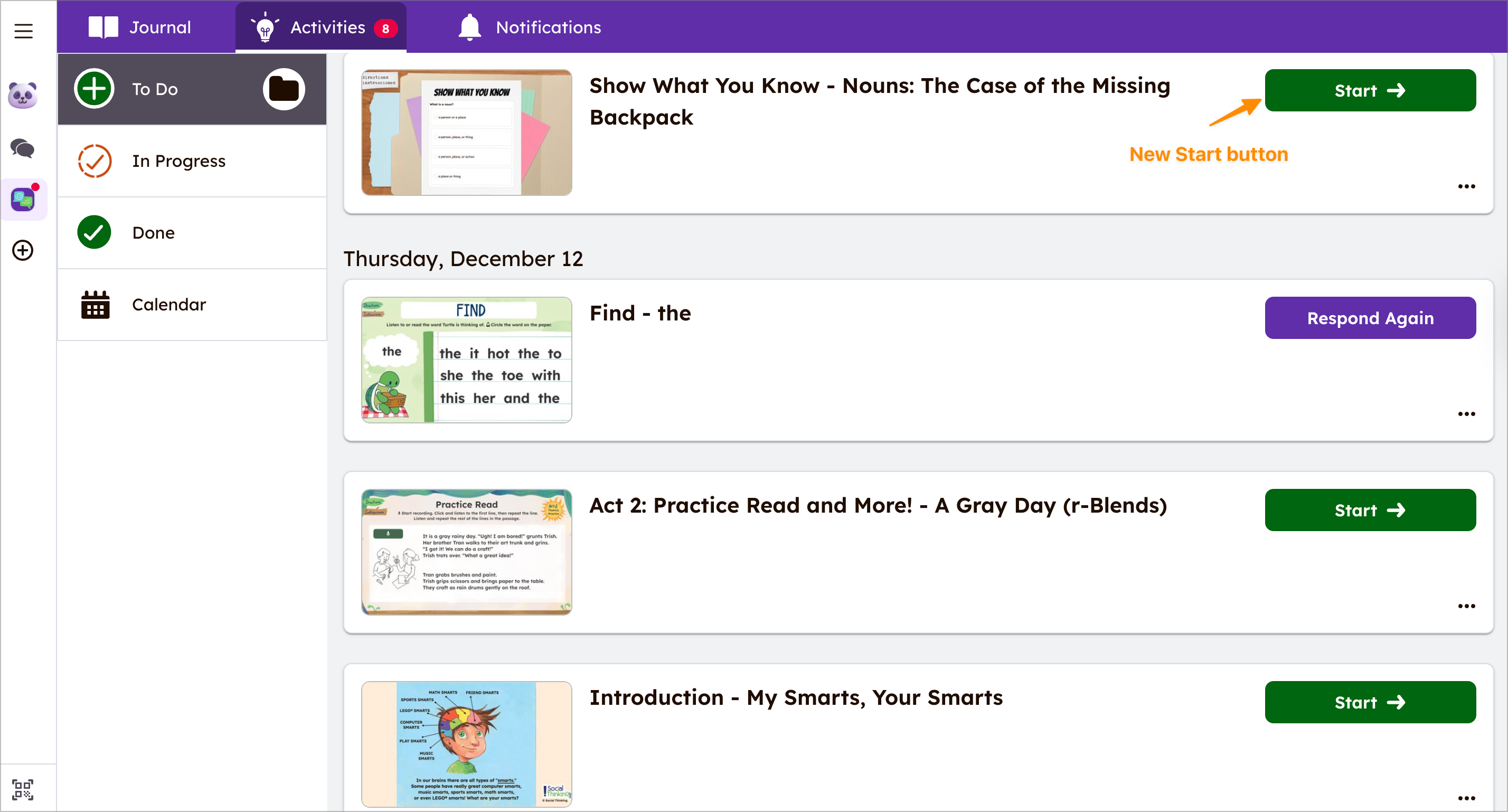 வளர்ச்சியடைந்த கல்வியாளருக்கான அனுபவம் அறிமுகப்படுத்தப்பட்டதுடன், மாணவர்களும் புதிய, எளிமையான இடைமுகத்தை அனுபவிப்பார்கள்! புதுப்பிக்கப்பட்ட மாணவர் செயல்பாட்டு ஓட்டம் ஆசிரியர்களுக்கு மாணவர்களை எளிதாக வழிநடத்தும் வழிகாட்டப்பட்ட இடைமுகத்துடன் செயல்பாடுகளை நடத்த உதவுகிறது. செயல்பாடுகளில் இந்த புதுப்பிக்கப்பட்ட அனுபவம் மாணவர்களுக்கு செயல்பாடுகளை துவங்க, உள்ளடக்கத்தை அணுக மற்றும் பணிகளை சுயமாக முடிக்க எளிதாக்குகிறது.