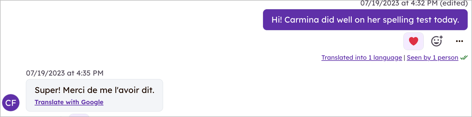 உங்கள் மொழியிலிருந்து வேறுபட்ட மொழியில் உள்ள உள்ளடக்கம் எழுதப்பட்டால், Seesaw தானாகவே “மொழிபெயர்ப்பு பார்க்க” என்ற விருப்பத்தை காட்டும். இது வலை, iOS, Android மற்றும் Kindle இல் ஆசிரியர்கள் மற்றும் குடும்பங்களுக்கு கிடைக்கும். மாணவர்கள் மொழிபெயர்ப்பு விருப்பங்களை காணமுடியாது.