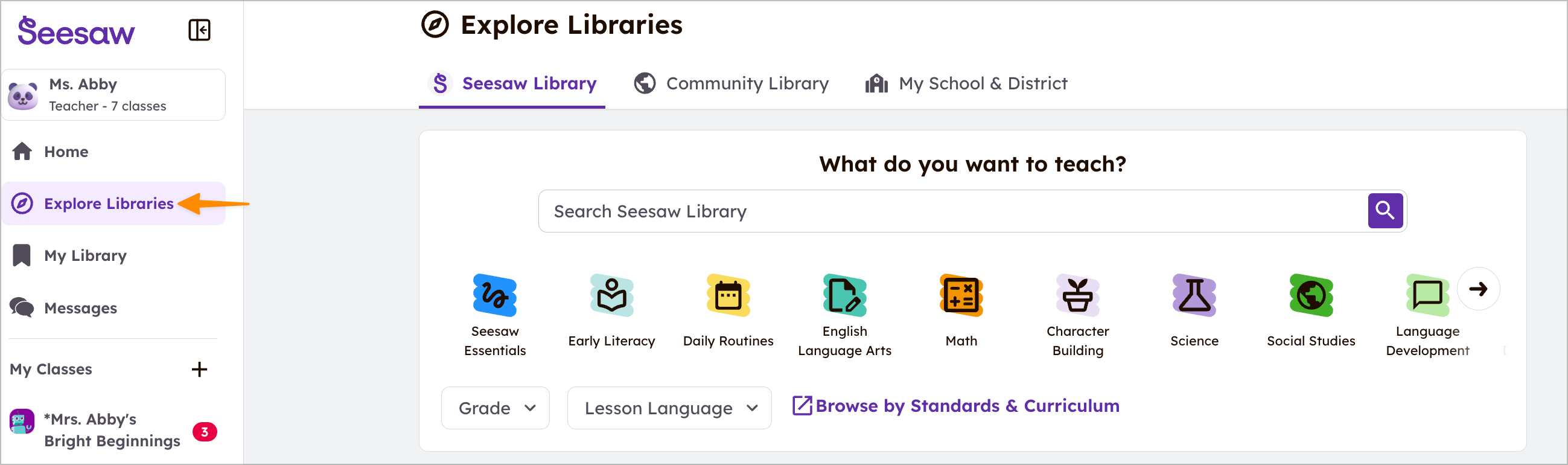 Seesaw நூலகத்தில் பல்வேறு பாடப் பகுதிகளில் ஆயிரக்கணக்கான கற்பிக்க தயாரான, தரநிலை இணைந்த PreK-6 பாடங்கள் உள்ளன, இது கல்வியாளர்களுக்கு உயர்தரமான, மகிழ்ச்சியான, உட்புகும் வகுப்பை வழங்க உதவுகிறது. பாடத்திட்ட நிபுணர்களால் வடிவமைக்கப்பட்ட பாடங்கள் ஆன்லைன் மற்றும் ஆஃப்லைன் கற்றலை பொருத்தமான முறையில் சமநிலைப்படுத்தி, ஆசிரியர்களின் நேரத்தை சேமிக்கின்றன.