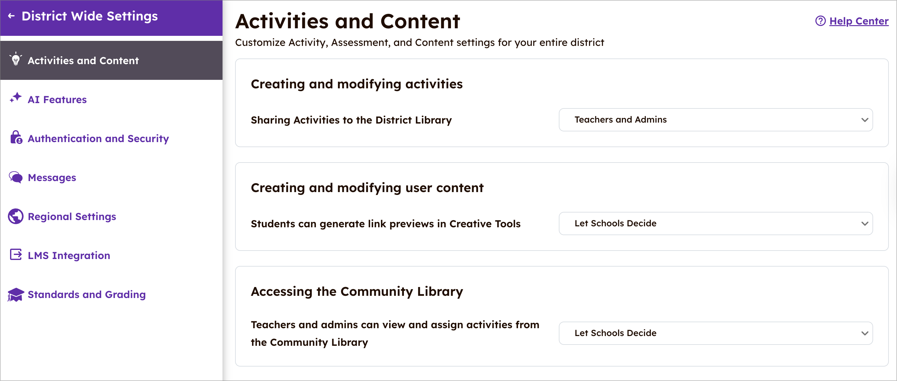 ผู้ดูแลระบบโรงเรียนและเขตพื้นที่สามารถจัดการว่าครูจะสามารถแชร์กิจกรรมไปยัง ห้องสมุดโรงเรียนหรือเขตพื้นที่ ได้หรือไม่โดยการอัปเดตการตั้งค่าในแผงควบคุมเขตพื้นที่