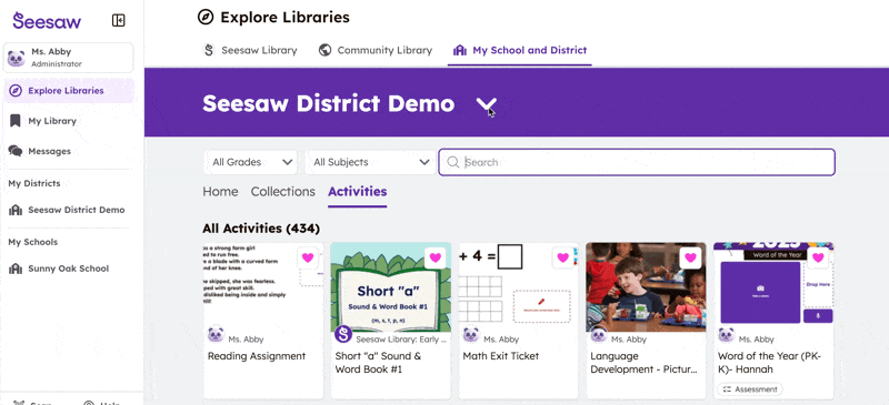 ผู้ดูแลระบบที่ใช้ Seesaw ในฐานะเขตพื้นที่สามารถเข้าถึงห้องสมุดจากบัญชีผู้ดูแลระบบของตนโดยไปที่ สำรวจห้องสมุด > โรงเรียนและเขตพื้นที่ของฉัน แตะที่ เมนูแบบเลื่อนลง เพื่อกรองห้องสมุดให้แสดงทั้งเขตพื้นที่หรือโรงเรียนเฉพาะ