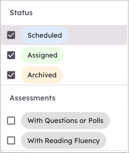 ปรับแต่งตัวกรองของคุณและ ค้นหากิจกรรมตามสถานะที่กำหนดเวลา, มอบหมาย และ/หรือ เก็บถาวร โดยการเลือกหรือยกเลิกเลือกกล่อง