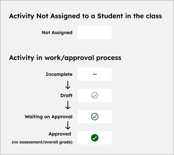 - เครื่องหมายถูกสีเขียวที่ไม่เต็ม = รอการอนุมัติจากครู