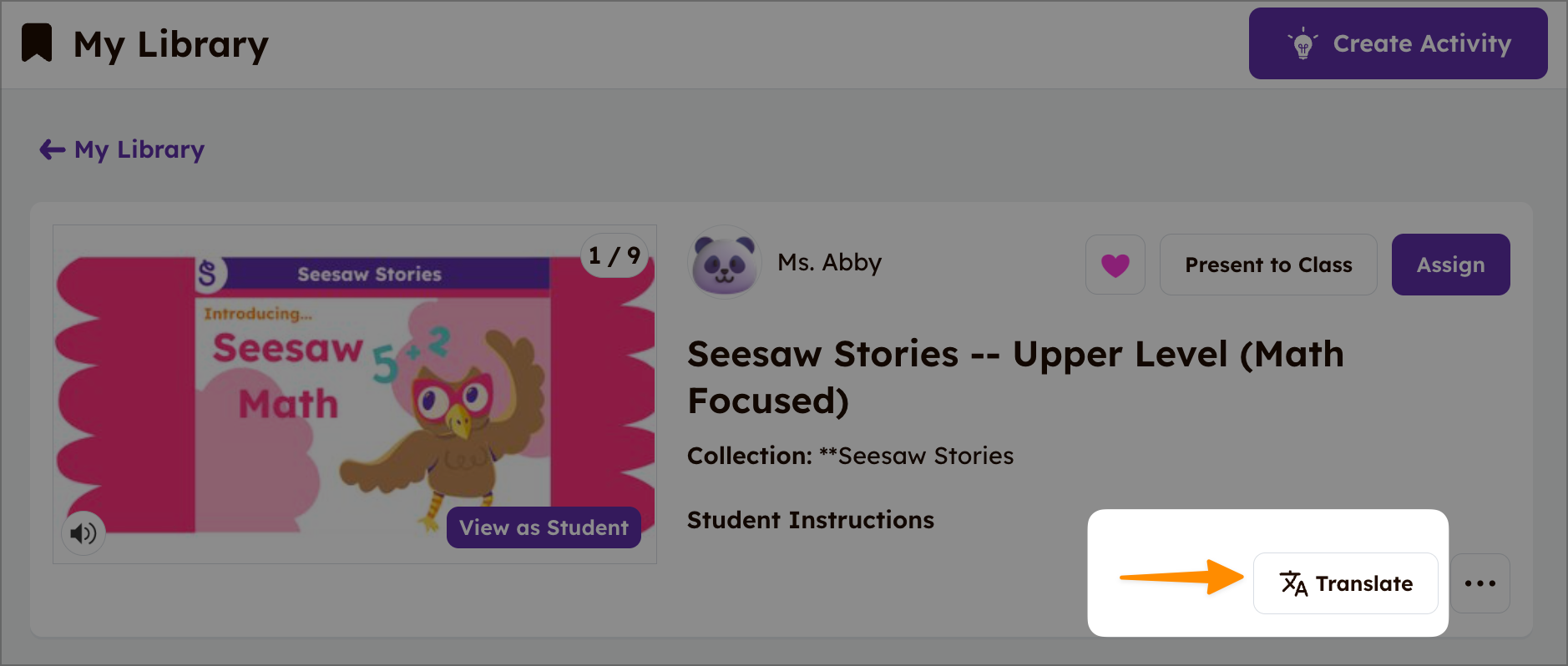 ครูสามารถแปลกิจกรรมและบทเรียนเป็น มากกว่า 100 ภาษา ได้ การแปลในตัวของ Seesaw ใช้ AI เพื่อให้การแปลที่รวดเร็ว พร้อมทั้งอนุญาตให้ครูปรับกิจกรรมตามความจำเป็น ซึ่งช่วยสนับสนุนนักเรียนหลายภาษา ห้องเรียนสองภาษา และการสอนภาษา ทั้งหมดนี้โดยไม่ต้องสร้างกิจกรรมใหม่หรือสูญเสียเจตนารมณ์การสอนเดิม